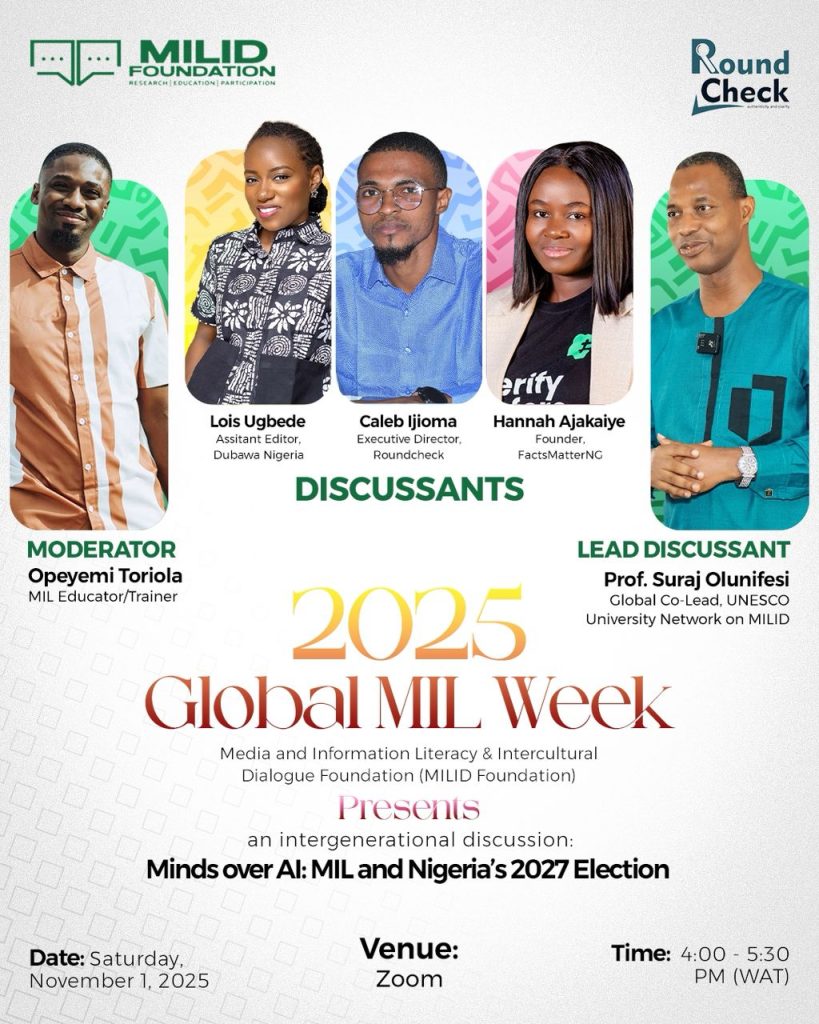 Themed Minds over AI: MIL and Nigeria’s 2027 Election, the event will be held in partnership with Roundcheck, a fact-checking organisation, to mark the 2025 UNESCO Global MIL Week.